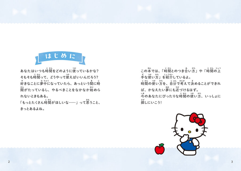 ハローキティの 夢をかなえる 時間の使い方 キャラクター 2026.01.132025.09.03 楽しく学んで時間の使い方上手になれる♪好きなことに熱中する時間、家族や友だちと過ごす時間、やるべきことをがんばる時間など、充実した時間を過ごすために大切なことを、ハローキティといっしょに考えてみよう!監修:白坂洋一(筑波大学附属小学校教諭) A5判/112ページ/フルカラー¥1,100+税/2025年9月発行ISBN:978-4-434-36356-6 関連書籍 ポムポムプリンのおかたづけポムポムプリンの おかたづけ ハローキティの夢をかなえる時間の使い方ポムポムプリンの おかたづけ マイメロディ・クロミのかわいいってなんだろう?さらに詳しく シナモロールのお友だちとなかよくするには?さらに詳しく ハローキティの幸せに気づく言葉さらに詳しく